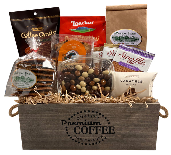How do you like your coffee? This coffee lovers basket is brewing with Wilson Farm's House Blend coffee, one large package of Loacker Italian cookies, our own crispy Chocolate Chip cookies, three flavors of Swoffle Dutch coffee biscuits, Almondina biscuits, McCrea's Mocha Caramels, and all natural chocolate covered espresso beans.