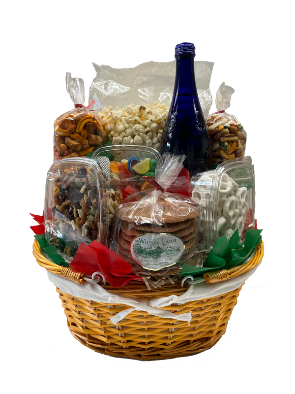 A snacker’s delight, this handle basket is filled with 19th Hole snack mix, Fiesta mix, Energy mix, and a bag of Wilson Farm Kettle Corn. On the sweet side you will find yogurt pretzels, Jelly Fruit slices, and Wilson Farm's crispy cookies. Great for break time or anytime, wash it all down with Saratoga sparkling water.