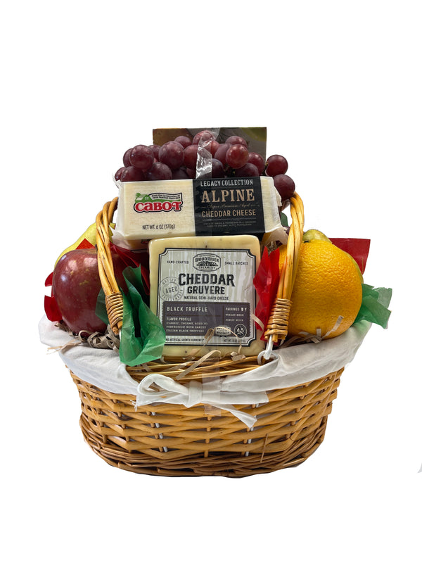Fruit and cheese are the perfect pair and this basket brings them together just for you! Enjoy delicious navel oranges, apples, pears, and grapes with Wood River Creamery Cheddar Gruyere Black Truffle Cheese and Cabot Alpine Aged Cheddar on top of Wisecracker Toasted Sesame Crackers.