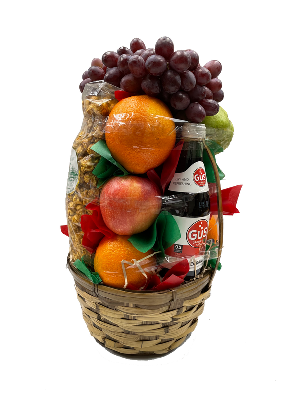 A refreshing abundance of fresh fruit, piled high! Perfect for any office or house warming gift, with over fifteen pieces of fruit, a twelve-ounce bottle of Gus all-natural soda and a package Wilson Farm caramel corn. This basket is jam-packed with navel oranges, seasonal apples, pears and red seedless grapes.
