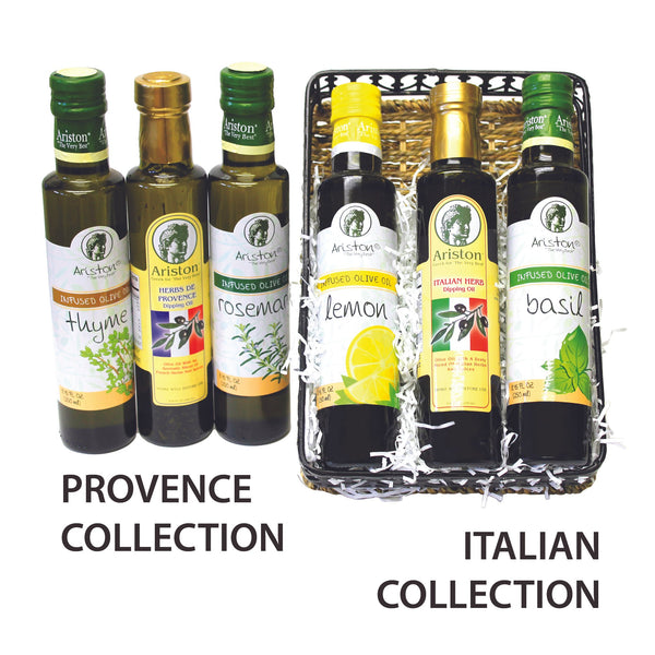 Our Provence Collection will transport you to the South of France with rosemary-infused olive oil, thyme-infused olive oil, and Herbs de Provence dipping oil. If zesty sun-drenched flavors are more your style, choose our Italian Collection, which includes lemon-infused olive oil, Italian Herb dipping oil, and basil-infused olive oil. You can also mix and match any three oils to create a customized gift set. Delizioso!