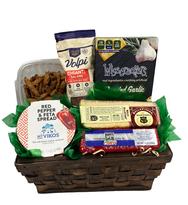 Our charming picnic basket has everything you need for a delightful al fresco meal! Red pepper and feta spread, Bellavitano Merlot cheese, Cabot cheddar, gourmet crackers, artisan salami, and scrumptious sesame sticks provide the makings of an unforgettable outdoor dining experience. Just add a blanket and a bottle of wine!