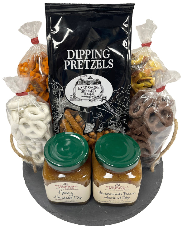 Looking for the perfect gift for that pretzel lover we all know? Well look no further because we have the basket made especially for them! The Pretzel Lover basket is beautifully designed on a slate board and will be sure to amaze. Eastern Shore's Dipping Pretzels were made to be enjoyed with Stonewall Kitchen's Horseradish Bacon Mustard and Stonewall Kitchen's Honey Mustard dips. Break away from the traditional pretzels and try our Honey Mustard or Hot Buffalo pretzel pieces. Make sure to save a little room from all this crunchy snacking to enjoy the sweet milk chocolate and yogurt-covered pretzels.