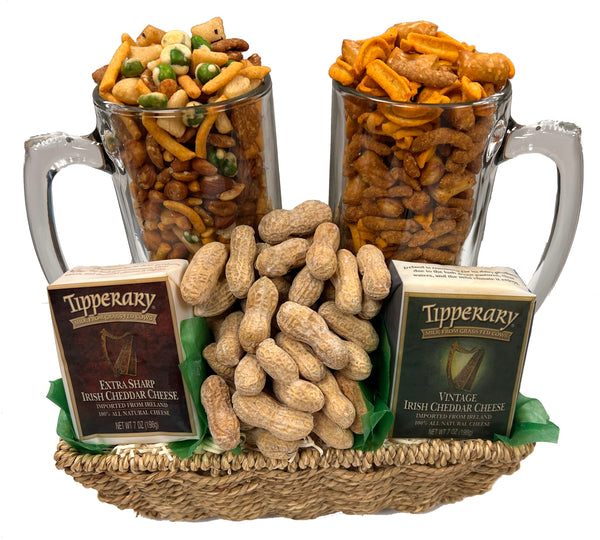 This basket covers all the bases! Filled with peanuts, tasty snack mixes, and flavorful Irish cheeses, it’s perfect for your favorite sports fanatic on game day, or for anyone who loves savory pub-style snacks. Also included are two extra-large beer mugs just waiting to be frosted & filled with your libation of choice!
