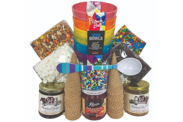 This sweet treat has everything to complete the perfect ice cream party. Loaded with toppings, this basket contains S&F Caramel Sea Salt and Decadent Fudge Sauces, Maraschino Cherries, Rainbow Sprinkles, Mini M&Ms, Oreo Cookie Topping, Mini Marshmallows, Peanut Butter Chocolate Crunch, Gluten-Free Sugar Cones, a 6-pack of colorful bowls with a scoop spoon to match! Yum!