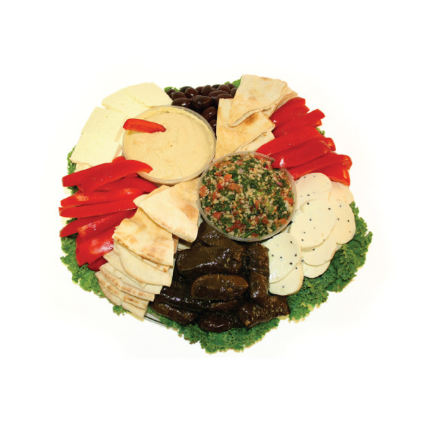 A Mediterranean delight! This healthy and flavorful platter contains feta cheese, pitted kalamata olives, Armenian string cheese, stuffed grape leaves, sliced red peppers, and fresh pita, not to mention fresh tabbouleh and all-natural hummus. Serves 20