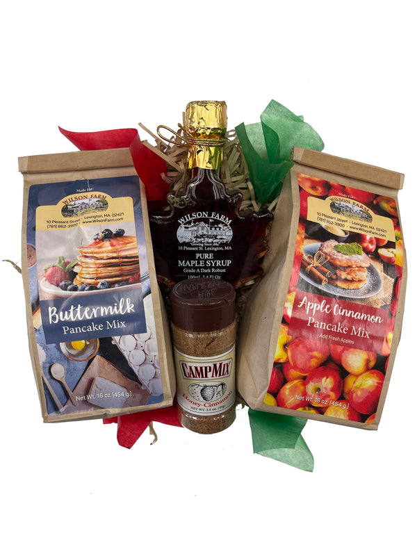 Who doesn’t love a stack of hot and fluffy pancakes or waffles? Your friends and relatives will, when they receive this Wilson Farm favorite. This lovely willow basket contains Wilson Farm’s own Buttermilk and Apple Cinnamon Pancake & Waffle mixes and eight ounces of our own grade-A maple syrup. Too Tall Tom’s honey cinnamon Camp Mix is also included for an unforgettable breakfast.
