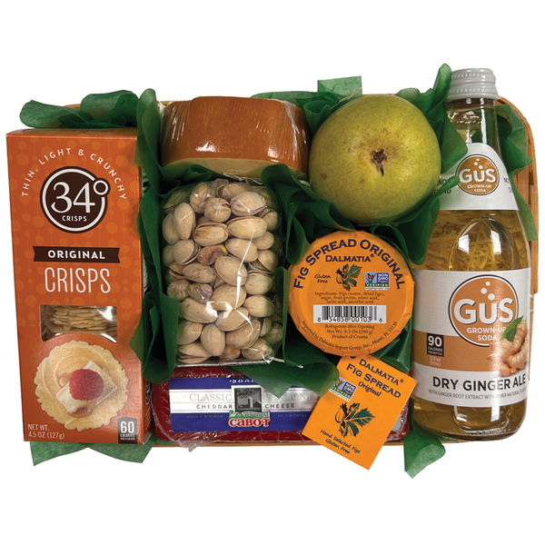 Cheese Basket - When choosing your next house-warming gift, think of this delightful basket of goodies. We start with two exceptional cheeses: A round smoked Gouda, an eight-ounce Cabot sharp cheddar, 34º Natural Crisp Bread, a jar of Dalmatia fig spread, pistachios, a juicy comice pear, and a bottle of Wilson Farm ginger ale.