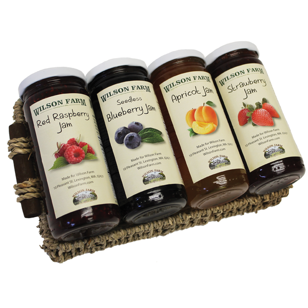 Wilson Farm jams are all-natural, made locally in Massachusetts, and are oh-so-delicious. Share four of our favorites in this basket including our red raspberry, seedless blueberry, apricot, and strawberry jams. Perfect on warm crusty bread or crisp crackers.