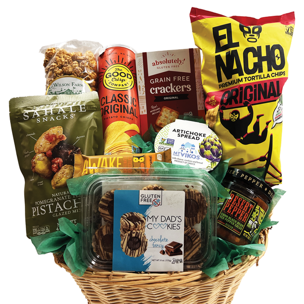 A perfect gift for anyone with a gluten sensitivity. Our basket includes a cornucopia of gluten-free snacks. Included are bags of Wilson Farm Caramel Corn, Sahale Snack nuts, and El Nacho tortilla chips / veggie straws / pop corners. Also included is a box of Absolutely Gluten-Free Crackers, Mt. Vikos Artichoke Spread, Desert Pepper Black Bean Dip, and a sleeve of The Good Crisps chips. Top off your sweet tooth with My Dad's Cookies and an Awake caffeinated chocolate bar. Indulge with no worries!